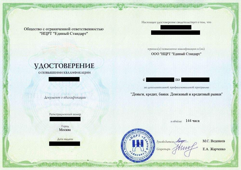 • Удостоверение о повышении квалификации установленного образца